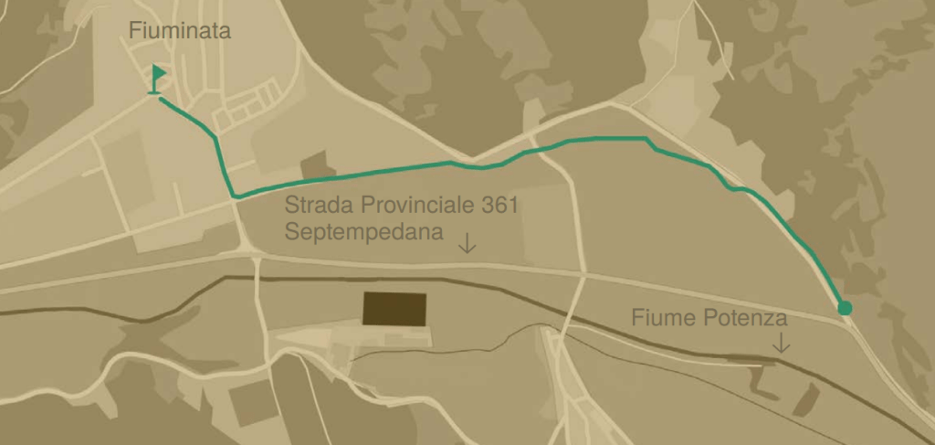 Il percorso attraversa le aree verdi adiacenti a Fiuminata. Un tempo questi campi venivano chiamati Canepine, poiché erano destinati alla coltivazione della Canapa, la pianta veniva utilizzata per le pregiate qualità della sua fibra con la quale venivano confezionati tessuti e cordame. Attualmente gli stessi campi vengono utilizzati in parte a seminativo e in parte a maggese. Il percorso si caratterizza per essere un tratto di fosso con vegetazione tipica degli ambienti umidi con vegetazione spontanea ad elevata naturalità, rara nelle Marche e a rischio di scomparsa. Gli ambienti umidi rivestono un ruolo fondamentale nella salvaguardia della biodiversità faunistica, in particolare per anfibi, uccelli ed invertebrati. Lungo il canale è possibile avvistare diverse specie animali come le nutrie e le papere; specie idrofitiche (cioè piante con radici inserite sul fondo dell’alveo e foglie completamente sommerse o galleggianti sull’acqua), a dominanza di callitriche cfr palustris, glyceria sp., nasturtium officinale, sparganium erectum, veronica anagallis-acquatica; specie elofitiche (piante con apparati radicali inseriti su terreni umidi e fangosi, inondati per una parte dell’anno, e apparati fogliari subaerei), a prevalenza di juncus inflexus, carex cfr acuta e typha latifolia; e specie degli ambienti temporaneamente inondati (piante che tollerano il disseccamento estivo del suolo), tra cui runex crispus, mentha longifolia e ranunculus repens.