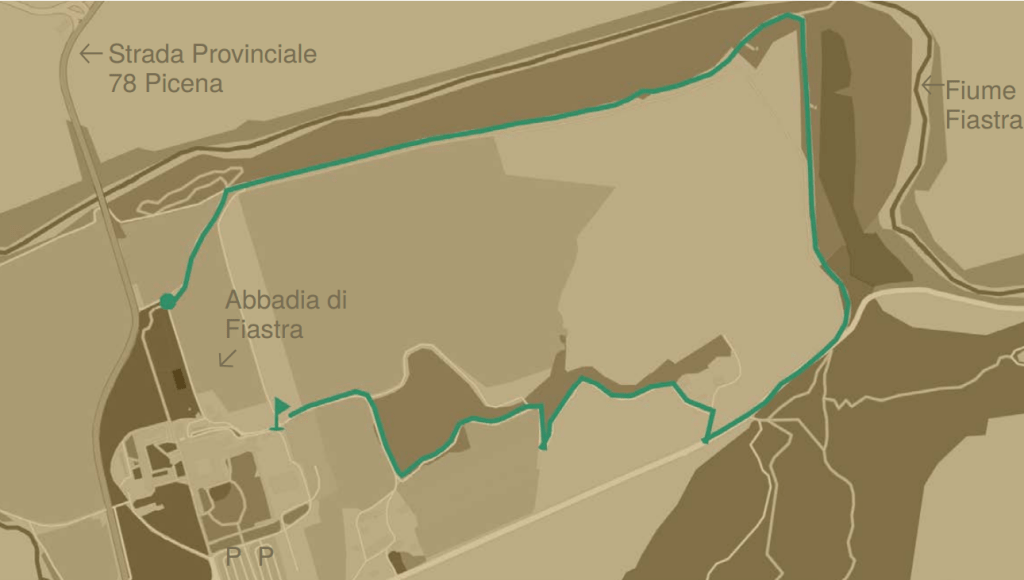 Dal parcheggio, in direzione nord est si raggiunge il piazzale selciato di fronte all’abbazia e al museo. Lo si percorre tutto, sempre nella stessa direzione, sino ad arrivare al vecchio sentiero per tutti (sbarrato con transenne). Da qui, voltando a destra, si percorre un viale che costeggia il fiume nascosto dalla fitta vegetazione sulla sinistra, e un vasto campo a seminativo sulla nostra destra. Arrivati in fondo, si volterà a destra, avendo stavolta delle zone umide sulla nostra sinistra e sempre i coltivi a destra. Questa è la zona della riserva dove si può incontrare l’avifauna. Si costeggia il laghetto fino in fondo, dove si svolterà di nuovo a destra. Affiancati al sentiero 21 bis per poche decine di metri, per una sterrata ci si allontanerà da esso, fino a raggiungere l’Abbadia nei pressi del parcheggio.