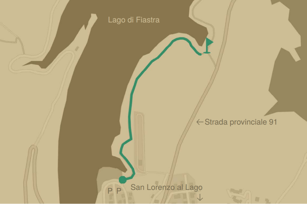 Il percorso inizia dalla spiaggia di San Lorenzo al Lago (Fiastra) nei pressi dell’ampio parcheggio. Si snoda al limitare delle spiagge del lago, appena sopra il livello massimo dell’acqua, maestosi sono gli scorci sui Sibillini, notevole la vista del lago e delle frazioni di Fiastra immerse nella boscaglia. Il tracciato termina con una più ampia piazzola nei pressi di una fontanella. Per rientrare al parcheggio, si ripercorre il sentiero in senso inverso.
